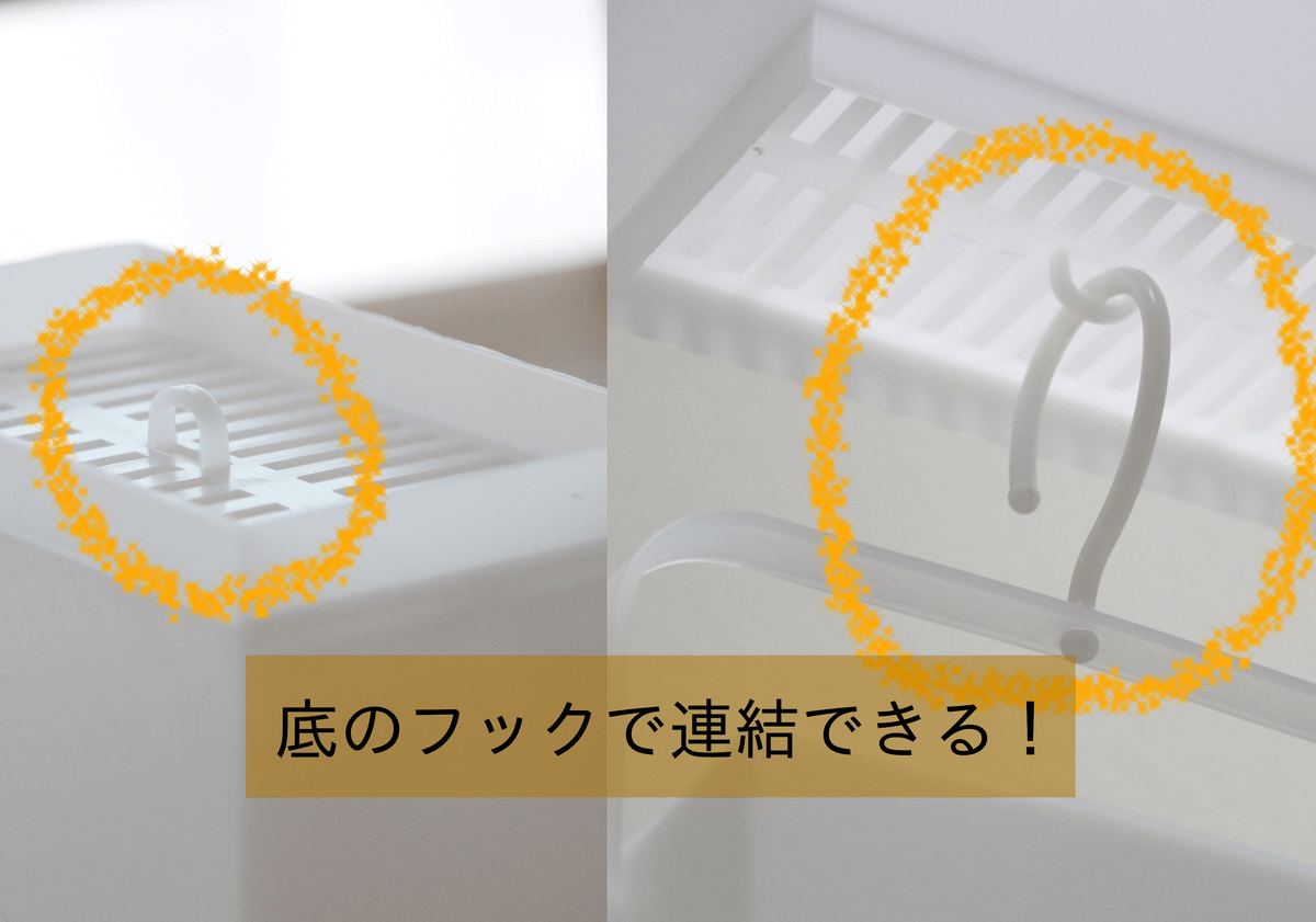 底の中心にフックがあり、バスケットを連結することができます。 連結したときにフックが外れることなくとても安定しています。