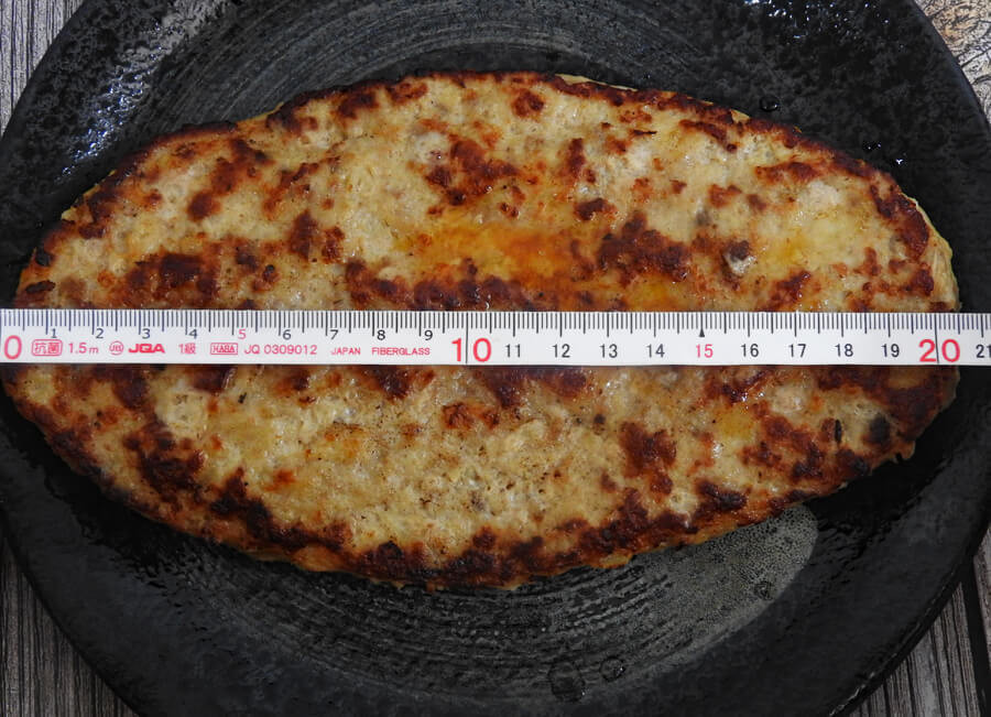 あまりにも大きいハンバーグを目の当たりにして面喰ってしまった私。思わず、手持ちのメジャーでハンバーグ横の長さを測ってみました。なんと、約20cmもありますね!