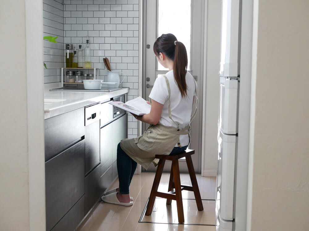 煮込み時間は少し手があくけど、リビングでゆっくりする程の時間はない、煮込みながらも目は離せない、そんなキッチンでのちょっとした待ち時間にもスツールが活躍!