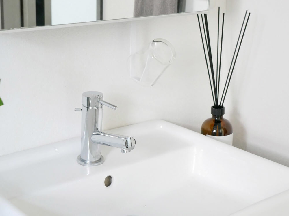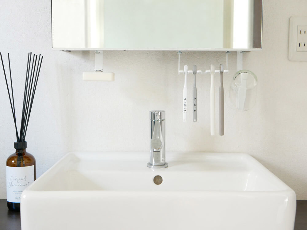 “すっきり”とした空間にする為には、物を置かない事が手っ取り早いのですが、歯磨きや石鹸、コップなど一日一回手に取り、棚にしまう物は、やっぱり“出しっぱなし”が一番楽ちん。
