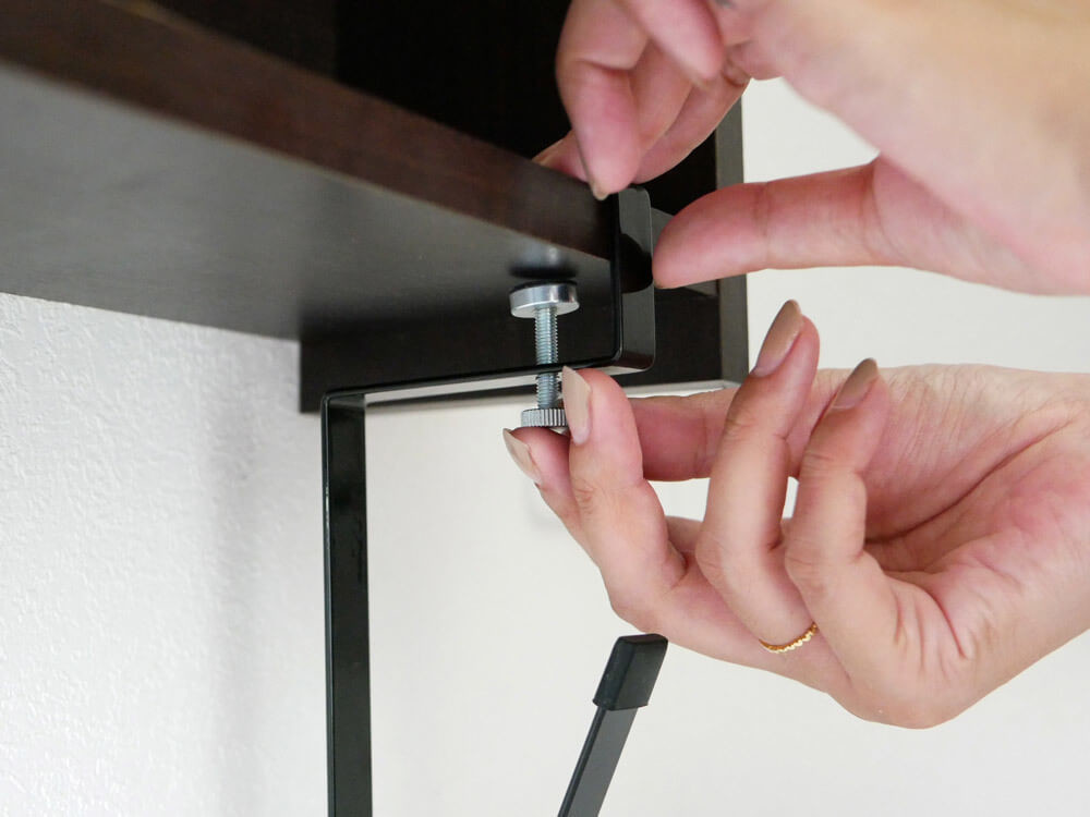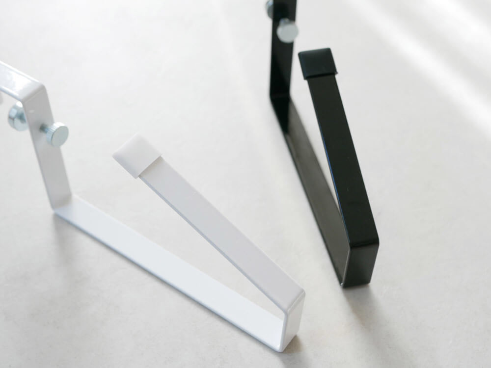戸棚の棚板にはさみ、調整ネジで固定するだけで、簡単に設置できます。横滑りや傷を付きにくくする、クッション付きなので安心。