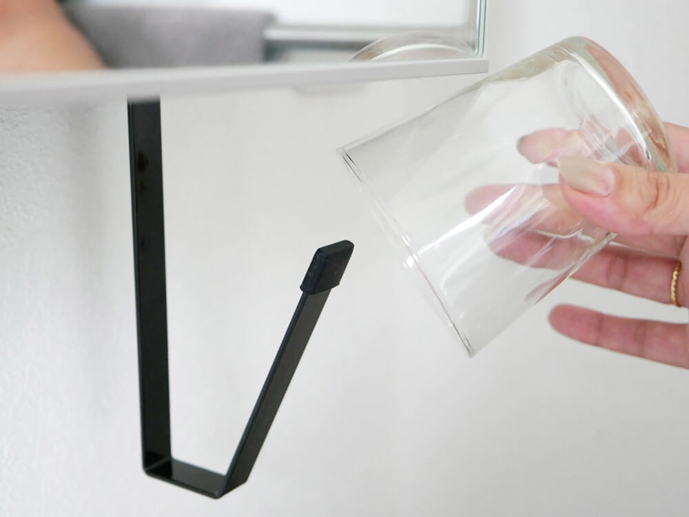 洗面所の戸棚下を有効に活用し、工具なしでタンブラーを逆さに掛ければ、いつも清潔に気持ちよく使えます。フックの先端にはクッションが付いているので、傷も気にせず気軽に収納できる、有能タンブラーホルダーです。