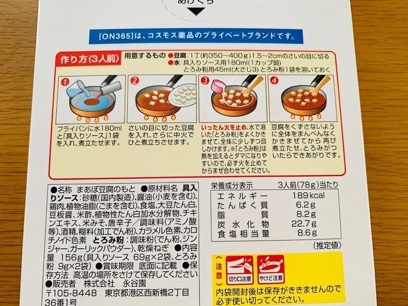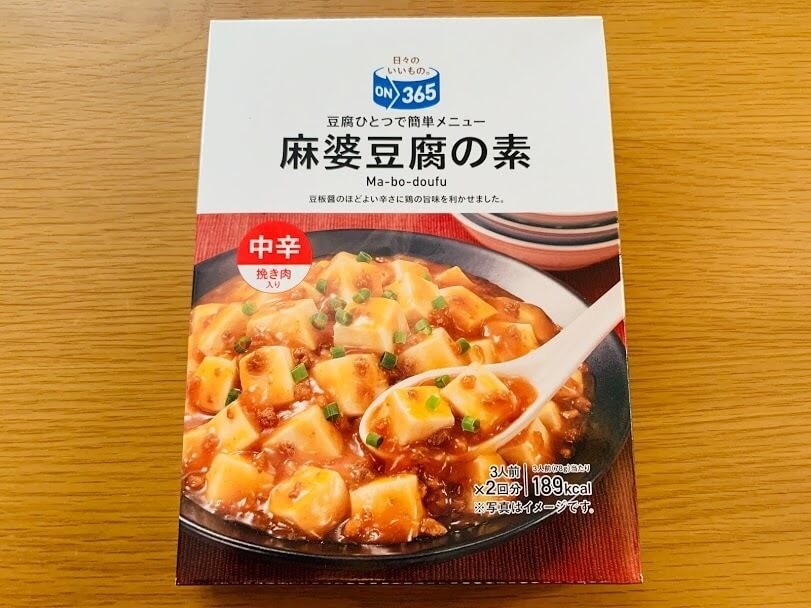 on365はコスモスのPB商品です。冷凍食品やチルド食品、レトルト食品、飲料からお菓子まで幅広いラインナップですが、その中でもおすすめの商品がこちら、麻婆豆腐の素。3人前が2袋入ってなんと税込で128円です。合計6人前作れちゃいます。
