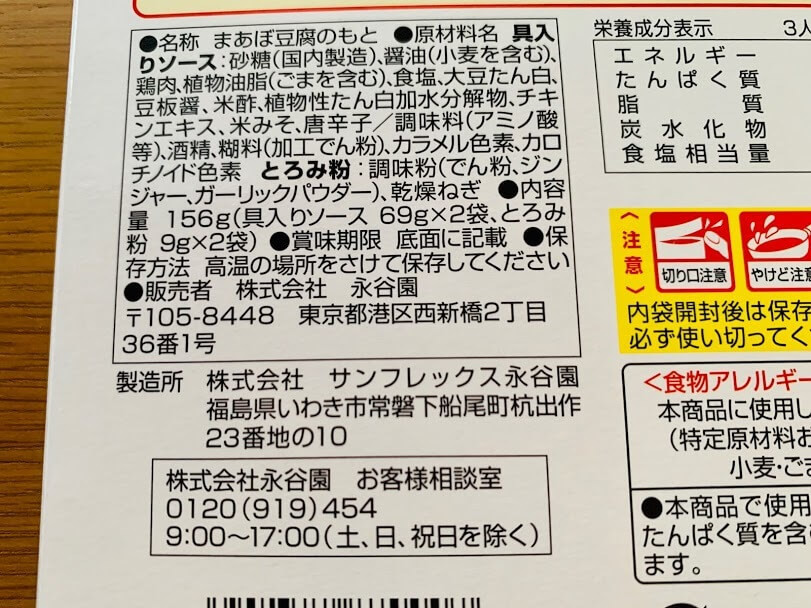 製造・販売者は永谷園。麻婆豆腐の素のくくりで言えば丸美屋やクックドゥよりは知名度が下がるかもしれませんが、私は何度か永谷園の中華総菜の素を買ったことがあるので安心して購入しました。