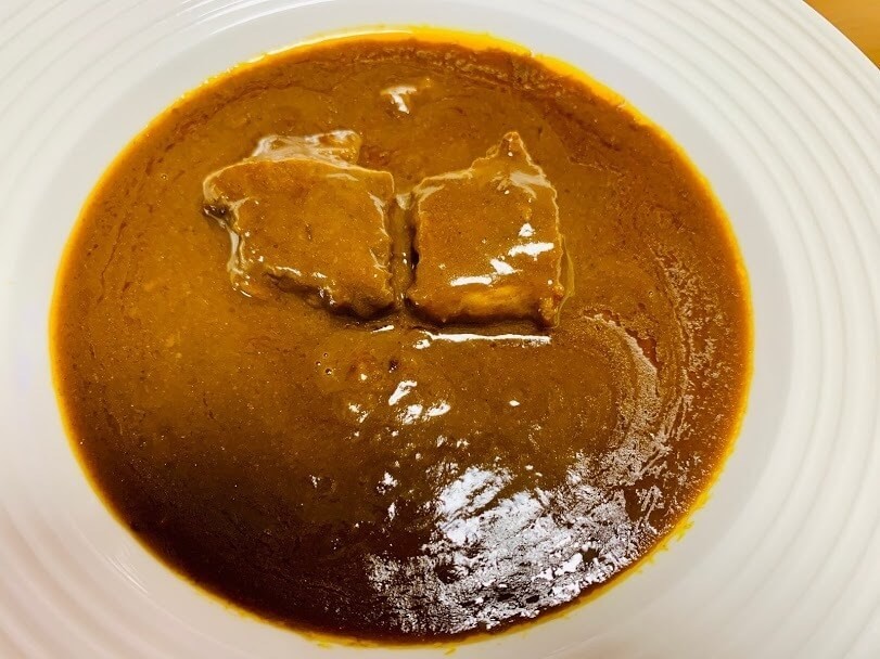 なんだかレストランで出てくるような上品なビジュアルです。ルーもさらっととドロッとの間の、ちょうどいいとろみ具合。ちょっと黒っぽく、コク深い感じ。何時間も煮込みました!といった感じ。
