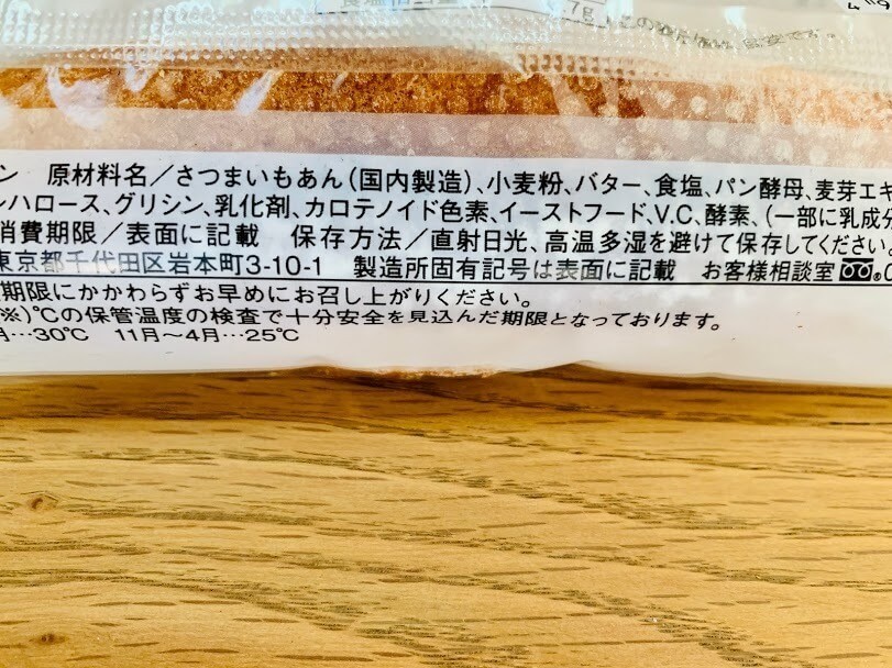 原材料の一番最初にさつまいもあんの文字が。コンビニのこういったパンに使われているバターは、実はマーガリンということもよくありますが、ちゃんとバターが使用されています。
