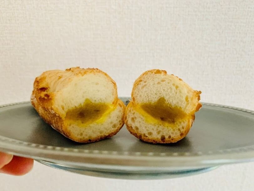 美しい2層の断面。パンとの間に隙間なんて一切なく、ぎっしりと詰まっています。安納芋のもったりとした黄色とバターの鮮やかな黄色が綺麗ですね。