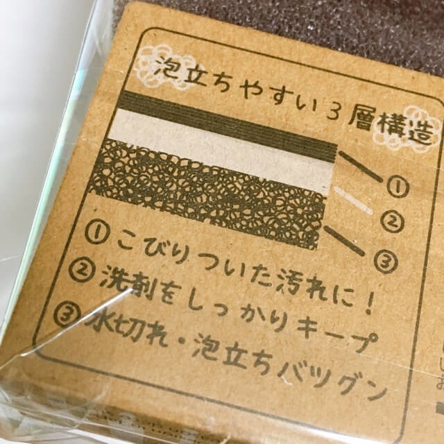 3COINSのキッチンスポンジは、泡立ちやすさを考えた3層構造。