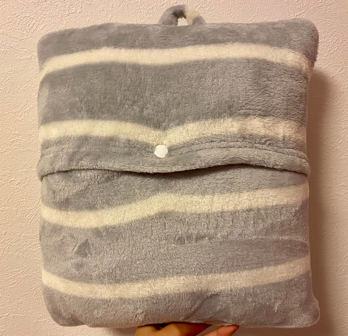 このようにコンパクトに折り畳んだ状態の着る毛布は、クッションとしても活用することができます。