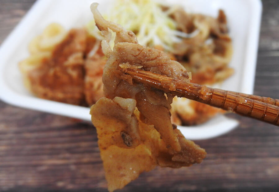 まずは豚バラ肉からいただきます。豚バラ肉は甘辛い味がしっかりと染み込んでいて、適度に脂身も。甘辛いすき焼きの味を好む人であれば、気に入る味に仕上がっていると思います。