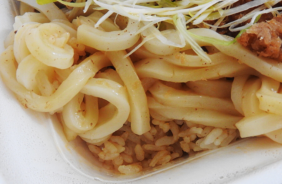「ごはんの上になぜうどんをトッピングしようと思ったのか?」とツッコミを入れつつ、うどんを食べました。うどんはもっちりとしていますね。