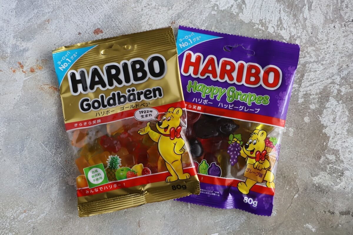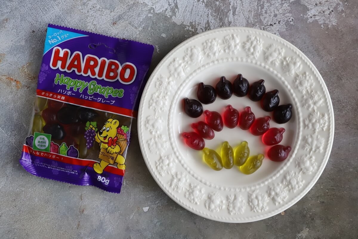 こちらの「ハリボー ハッピーグレープ」は3種類のぶどうの香りで、にっこりわらった顔のぶどうの形をしていいるグミです。