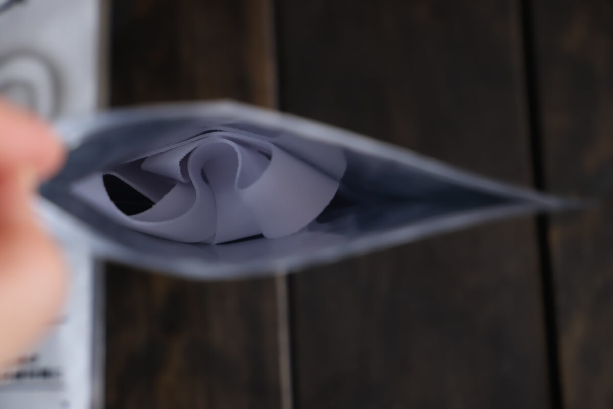 開封してすぐにつけたい!と思うかもしれませんが、注意書きには「一度水で軽く洗い、日陰で陰干しのち使用する」とありますので注意してくださいね。