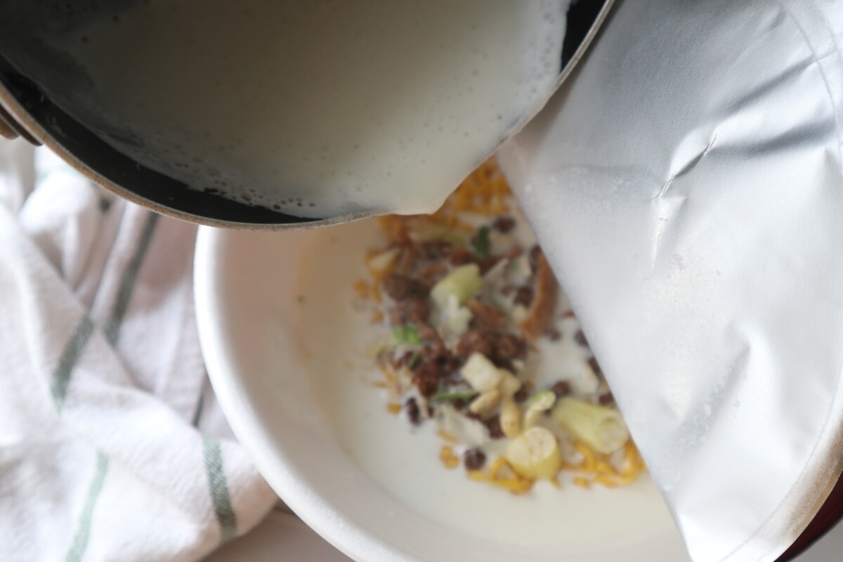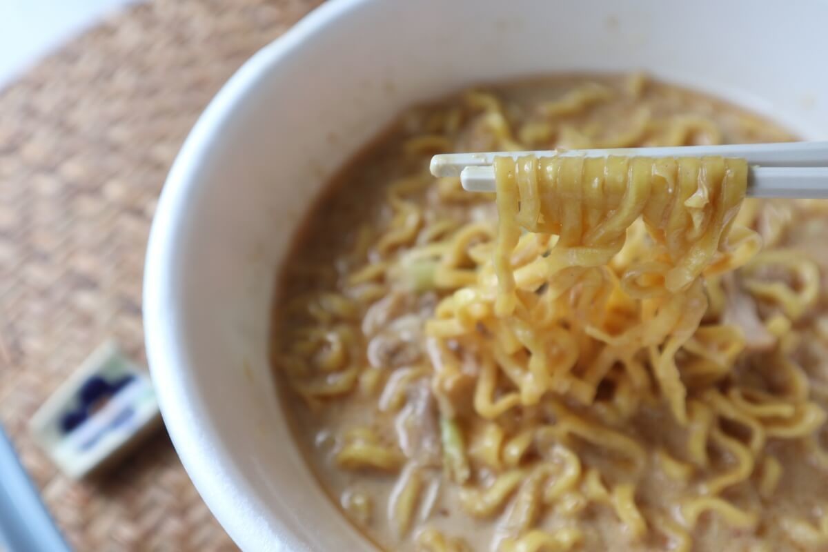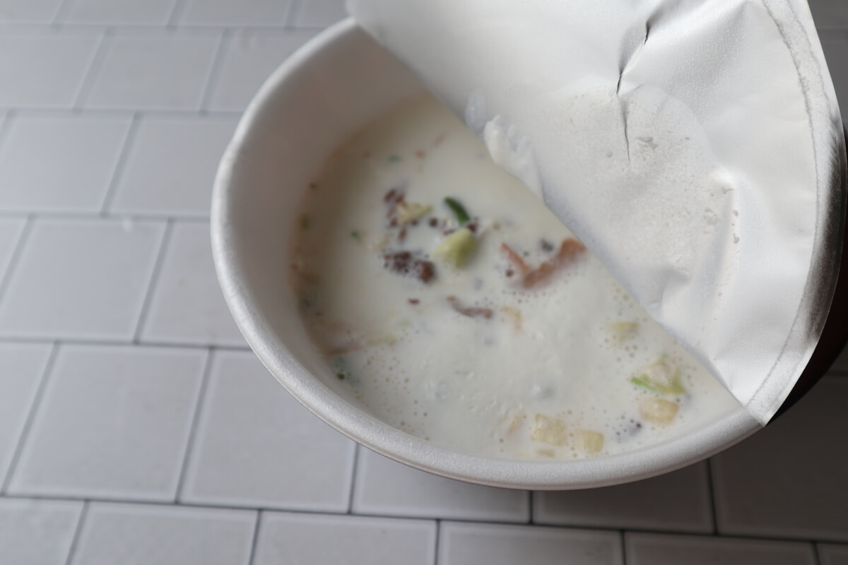 お湯よりも牛乳のほうが麺への吸収が悪いので、通常4分置くところ、6分置いてください。