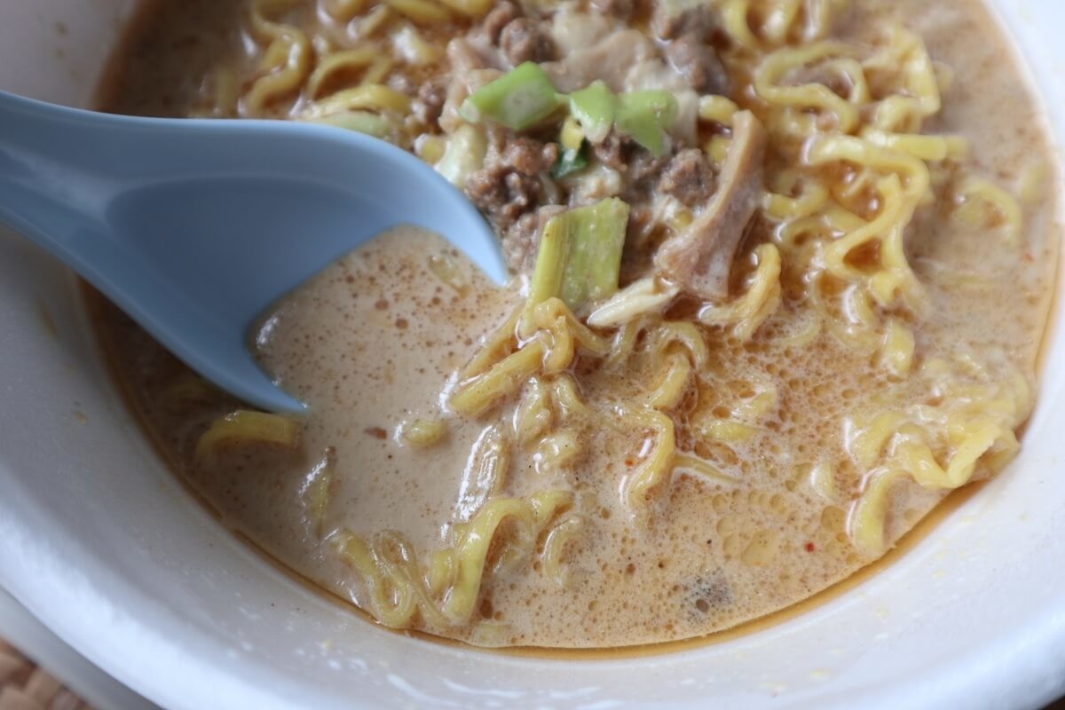 スープはこっくりさらに濃厚です!牛乳のまろやかさが加わり、クリーミィで担々麺のような味に!美味しいです!