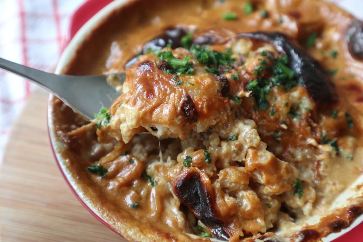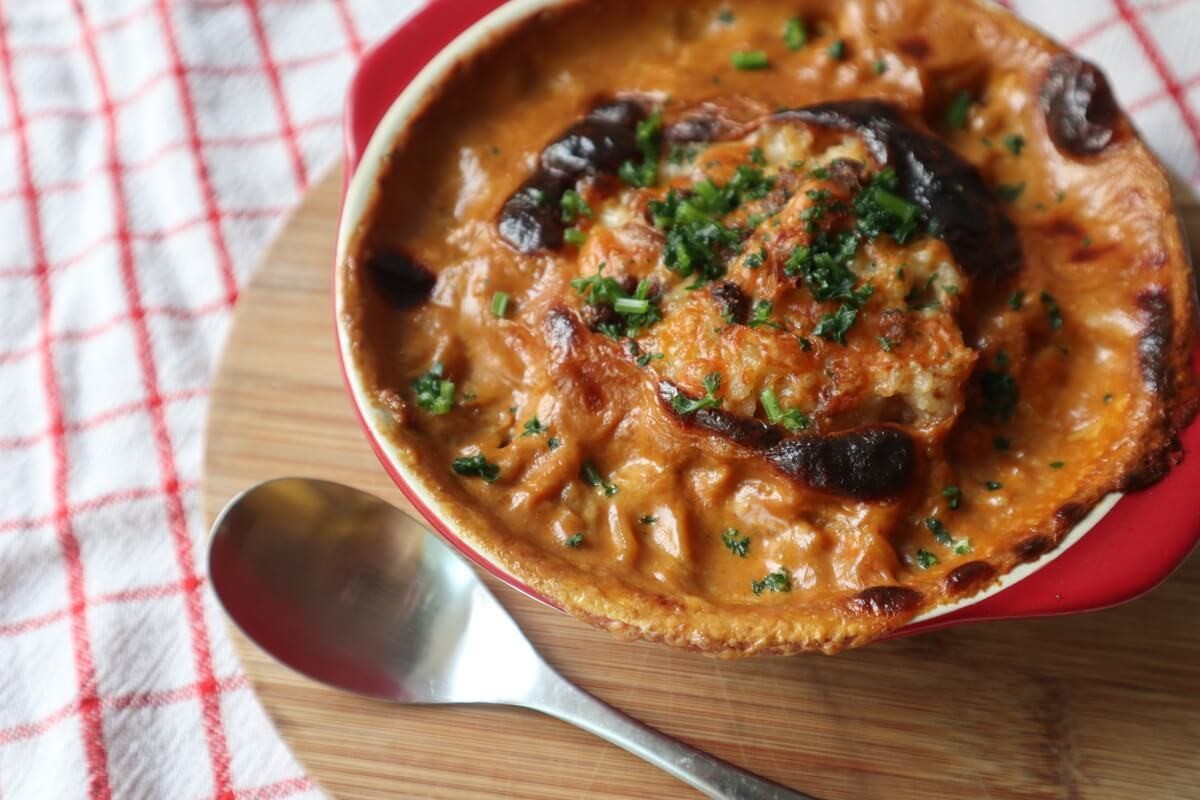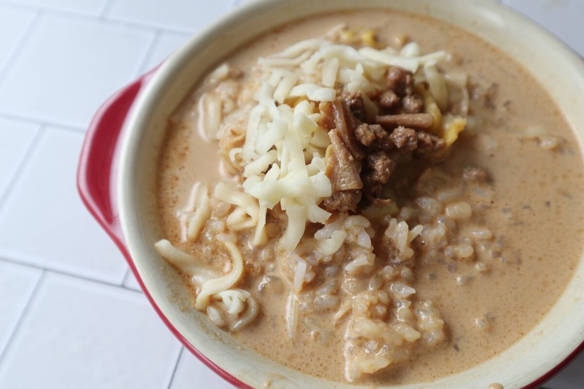 ご飯にスープをかけて、とろけるチーズをかけてトースターで表面にこんがり焦げ目がつくまで焼きます。