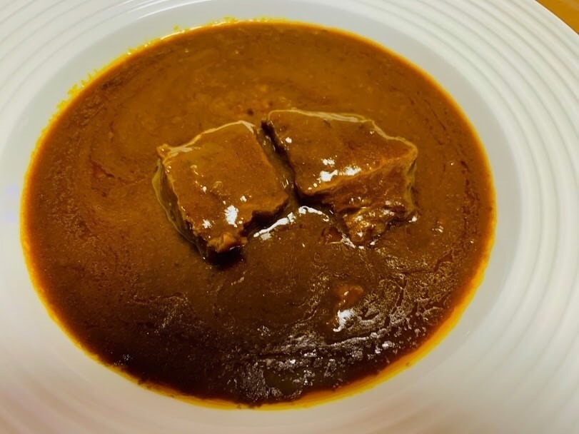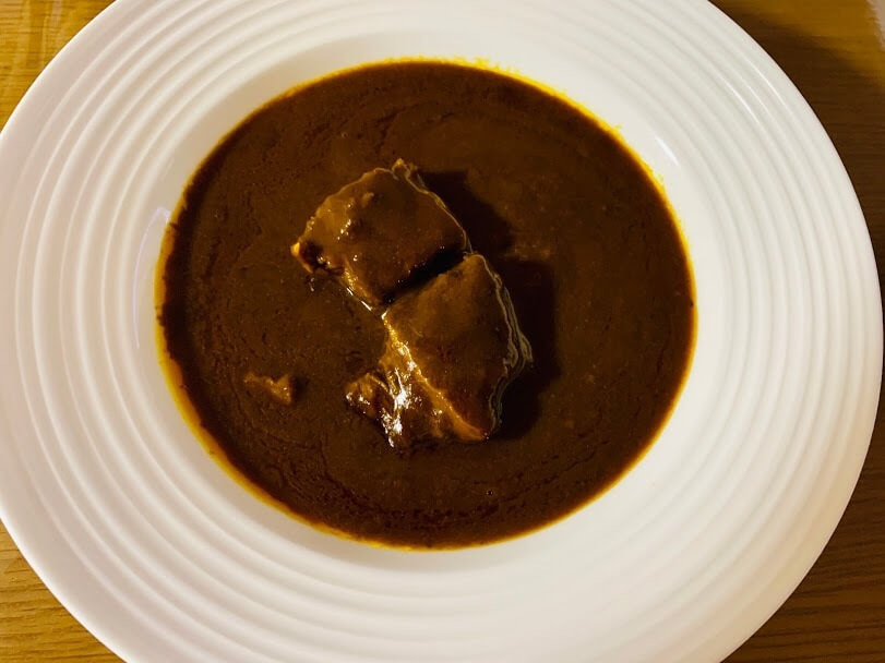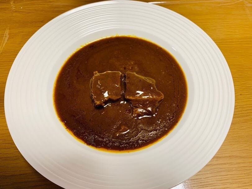 なんだかレストランで出てくるような上品なビジュアルです。ルーもさらっととドロッとの間の、ちょうどいいとろみ具合。ちょっと黒っぽく、コク深い感じ。何時間も煮込みました!といった感じ。