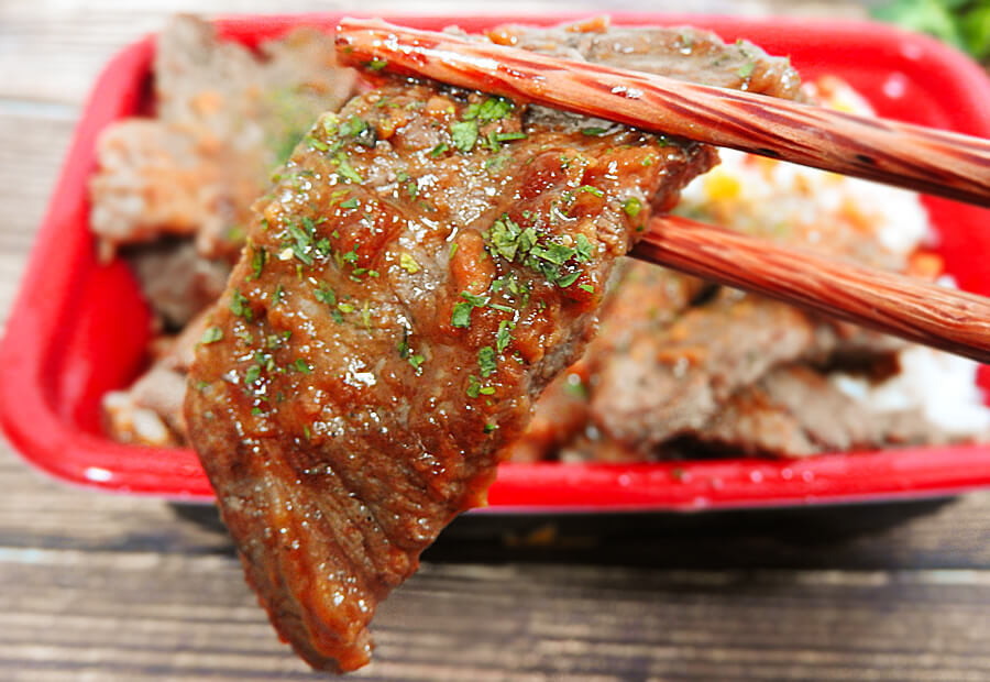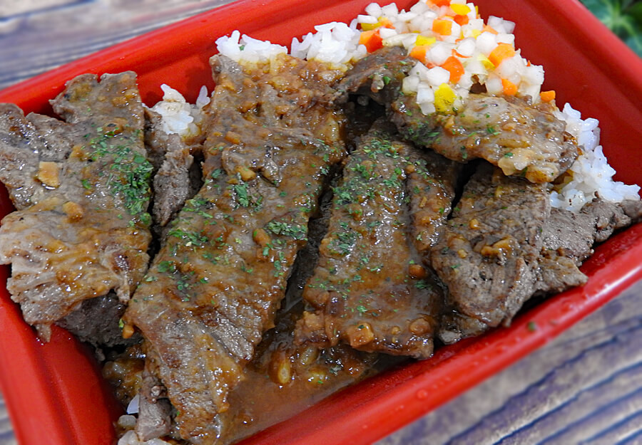 ふたを開けると、牛肉がどどーん!デカ盛りか?と言われると判定は微妙なところですが、通常のカットステーキよりは量が多いのは確実です。