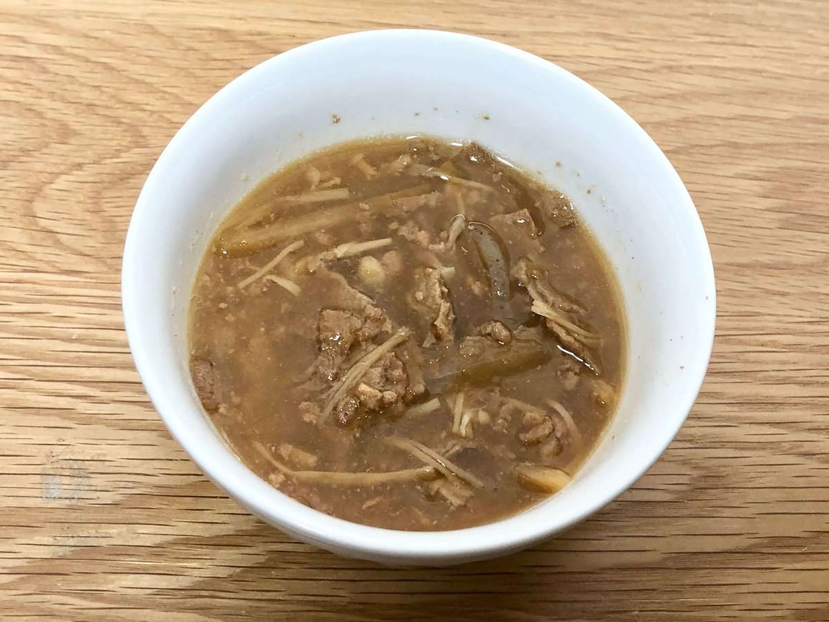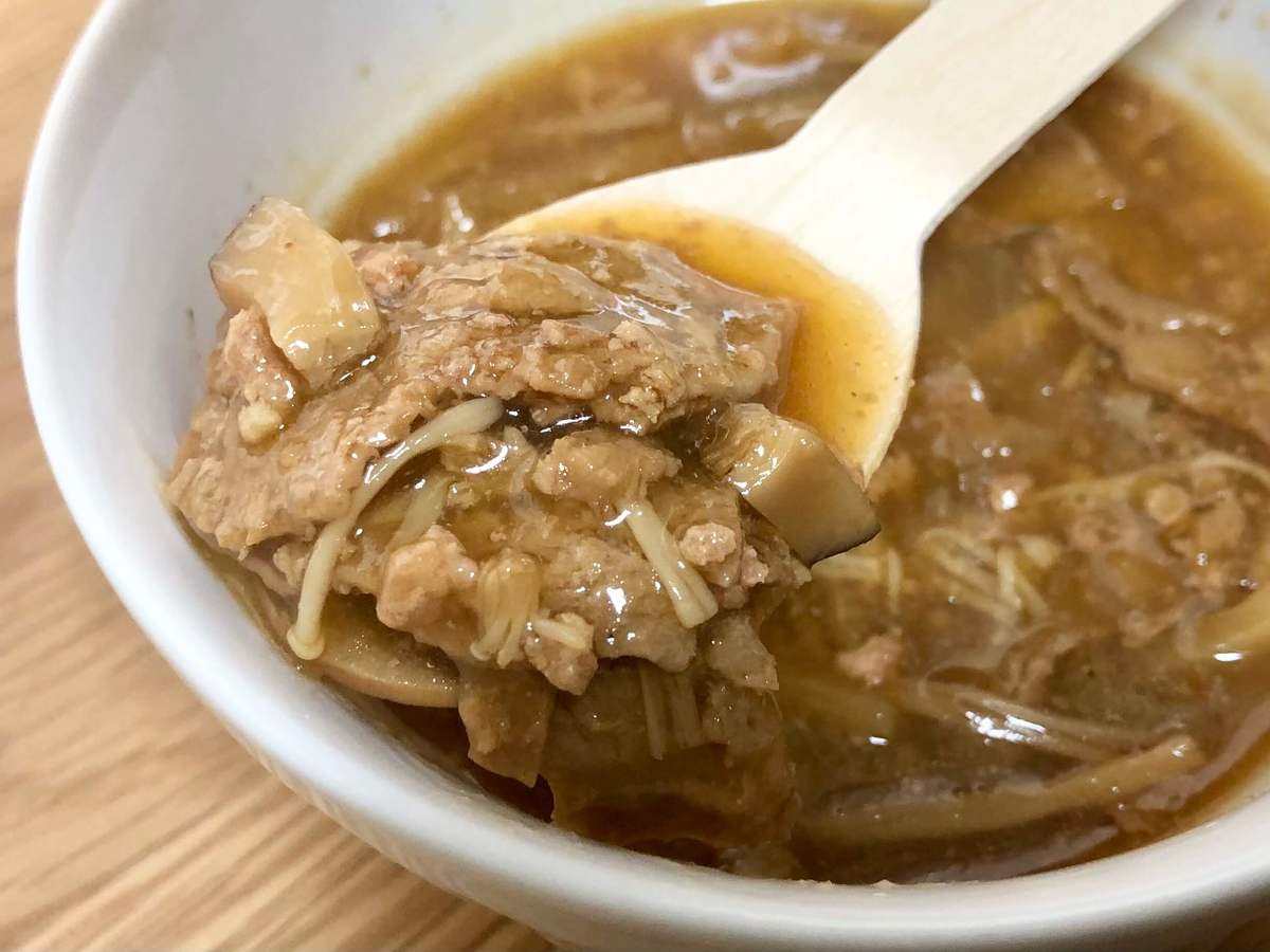 なんといっても具沢山!玉ねぎ、たけのこ、えのきだけ、白こんにゃく、しいたけが入っています。