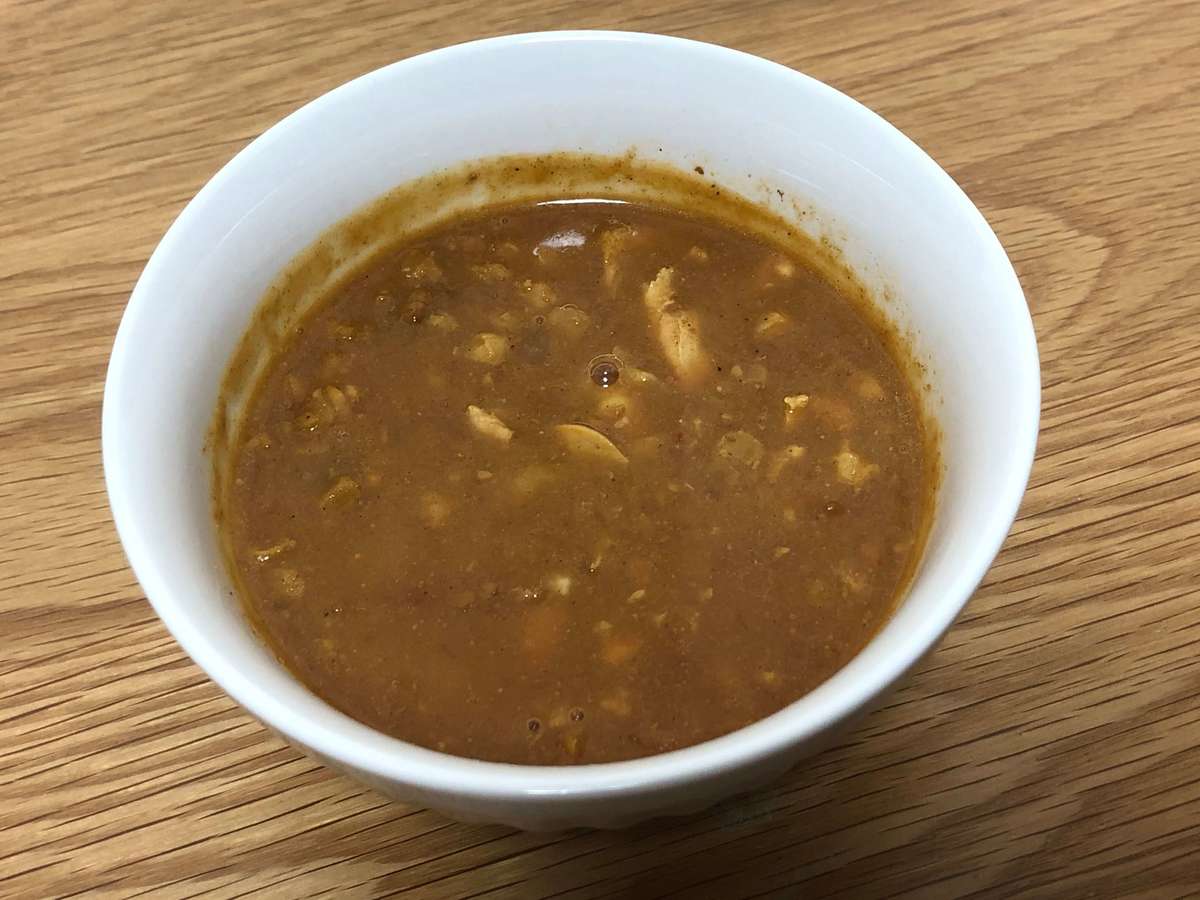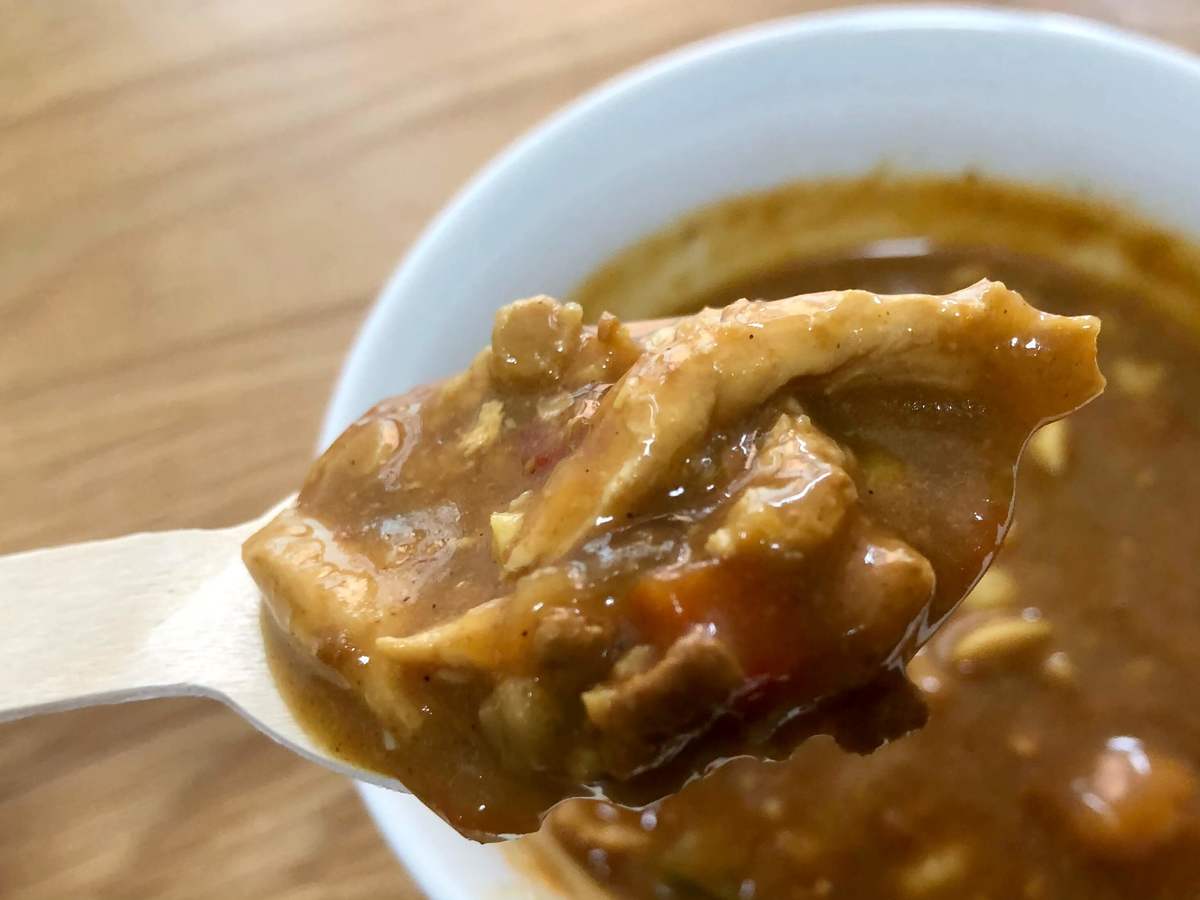 大きな鶏肉と、大豆ミートだと思われるひき肉が両方使われています。 野菜や豆がやわらかいのに対し鶏肉がやや硬めです。自然に噛む回数が増え、満腹感もアップ。