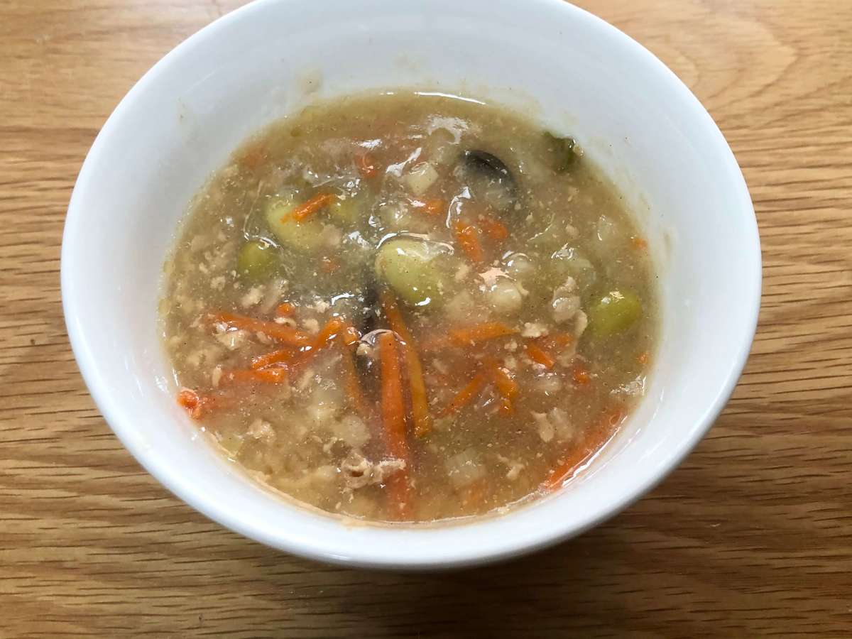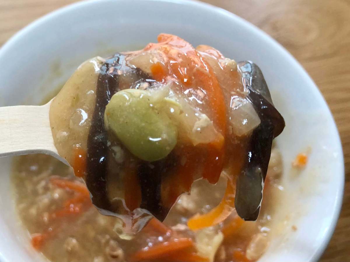 スプーンからあふれそうな大きなにんじんのほか、玉ねぎ、白菜、枝豆(大豆)たけのこと野菜がたくさん入っています。お肉は大豆ミートだけでなく、鶏と豚も使われています。