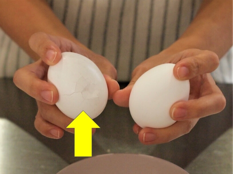 すると、片方の卵にだけ、ひびが入ります。もう一方の卵は無傷で、変化なしです。割れたほうの卵を見ると、ひびも表面にだけ入っており、白身が飛び出していないのがわかるかと思います。
