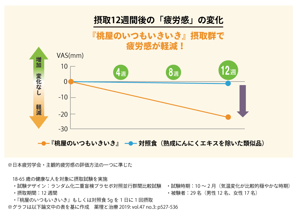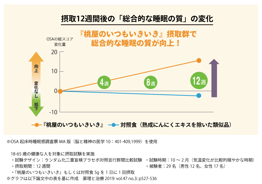 松井さん:「上は、『熟成にんにくエキス』の効果を示したものです。日常生活を続けた方々で、対照食(熟成にんにくエキスを含まない)を摂取したグループに大きな変化が見られなかったのに対して、『桃屋のいつもいきいき』を摂取したグループは、疲労感が軽減、総合的な睡眠の質が向上したという結果が出ています」