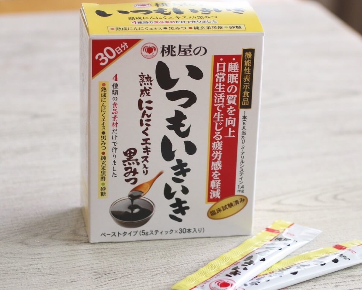 『いつもいきいき』の最大の特徴は、S-アリルシステインを含む熟成にんにくエキスが“日常の疲労感”と“睡眠の質”のダブルに効果的である点。実は、 “睡眠の質の向上”効果は当初意図していなかったもので、臨床試験中に発見したのだそう。