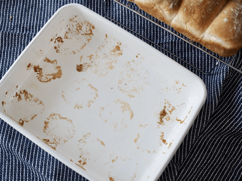 金属たわしや粒子の粗いクレンザーなどを使用すると、ホーロー表面のガラス質が傷ついてしまうので使用してはいけません。オーブン調理で焦げ付いてしまったときは、お湯に入れて汚れを浮かせてから、柔らかいスポンジで優しく洗いましょう。
