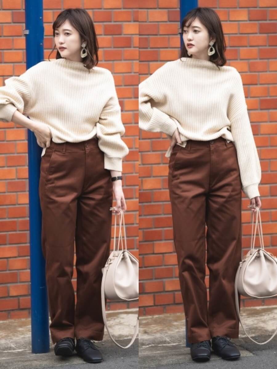 しまむらのボリュームニットにユニクロのパンツをコーディネートした、今っぽい大人カジュアルスタイル。