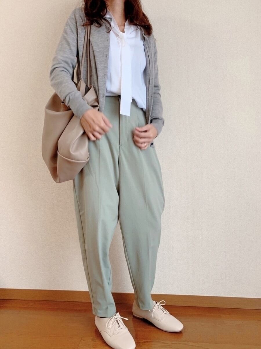 GUのグリーン色のコクーンパンツをベースにした、クリーンな秋コーデ。 ユニクロのカーディガンとボウタイブラウスをコーディネートして、クラシックなスタイルにシフトしています。