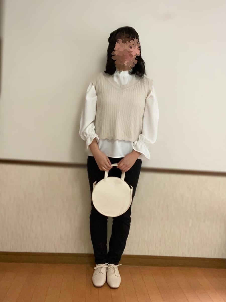 しまむらの黒スキニーに白いブラウスを合わせた、きれいめなモノトーンコーデ。