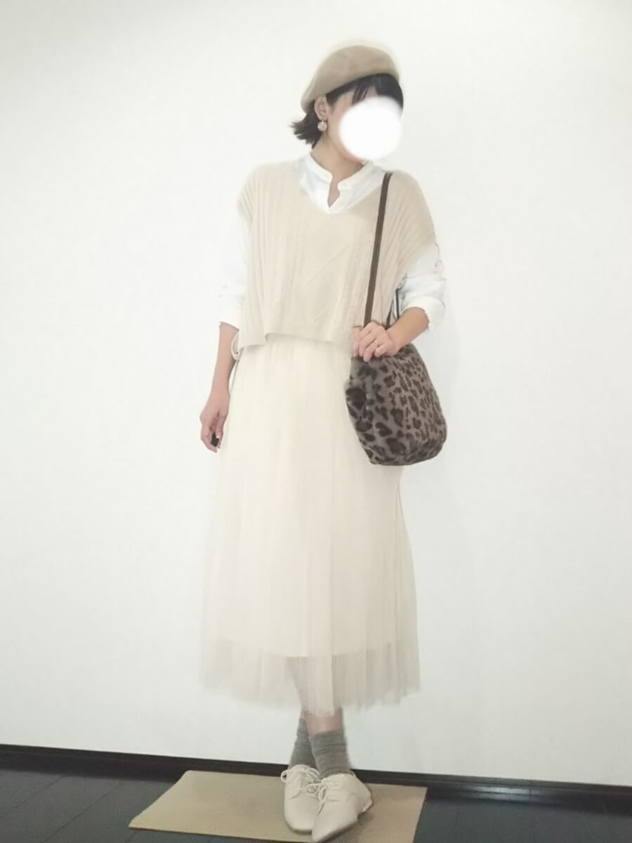 しまむらのレオパード柄バッグやベレー帽を合わせた巧妙な小物使いで、ワンランク上の秋の装いが完成です。