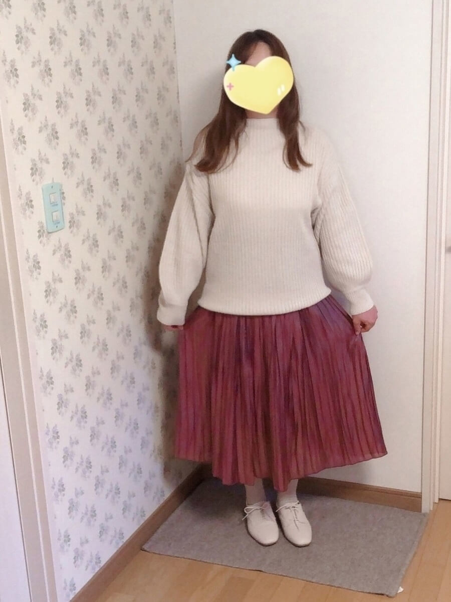 しまむらのシャイニープリーツスカートに、ざっくりニットをスタイリング。レッドとホワイトのツートーンコーデで、存在感を演出しています。