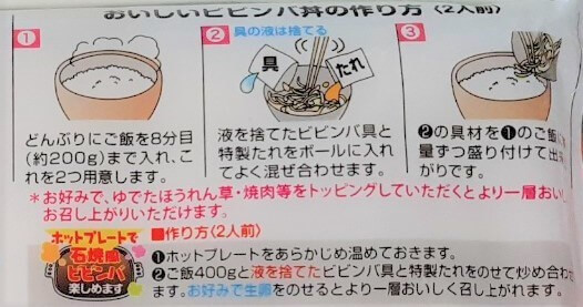 基本のつくり方は3ステップ!ビビンバの素をご飯にのせてさらにトッピングをのせるようですが、今回はご飯にビビンバの素を混ぜ込んでつくりました。