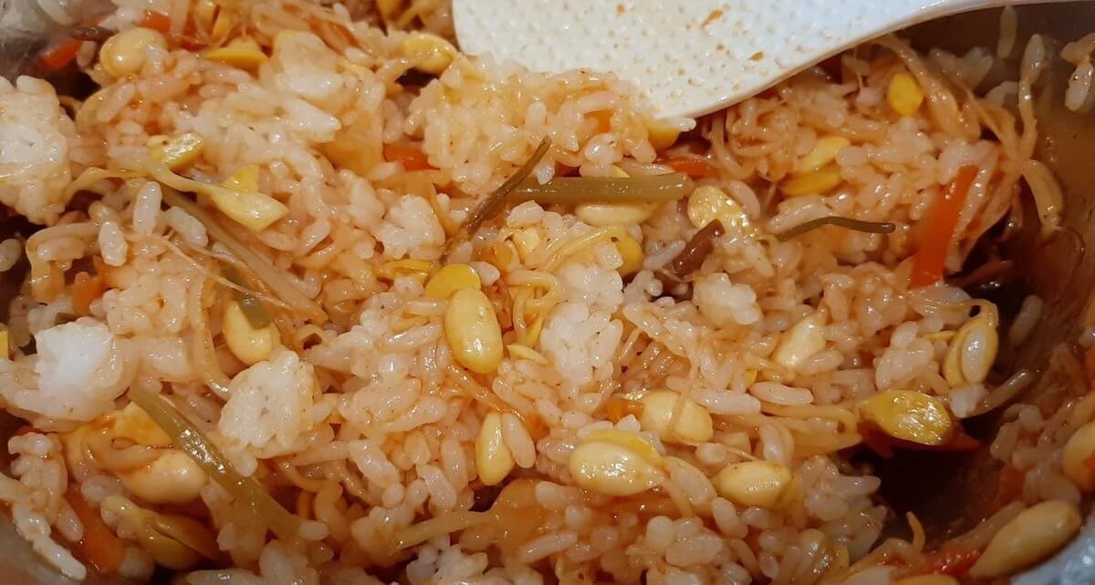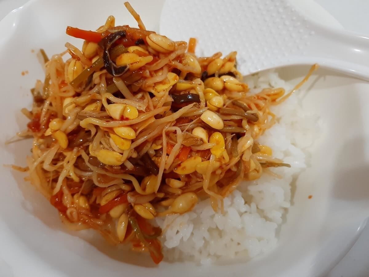 豆もやしがザクザク、他にもにんじんなどの野菜が入っていて食べ応え抜群。辛さは控えめだったので辛い物が苦手な人でも食べられそうです。