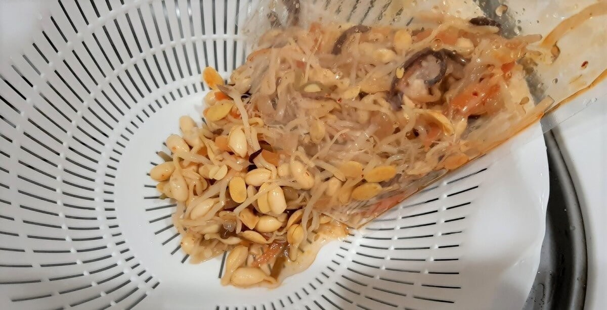 液は少しキムチのような酸っぱさがあるので、しっかりざるで水気をきっておきましょう。