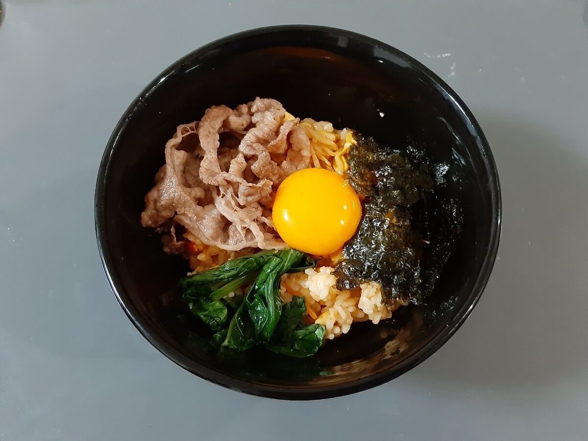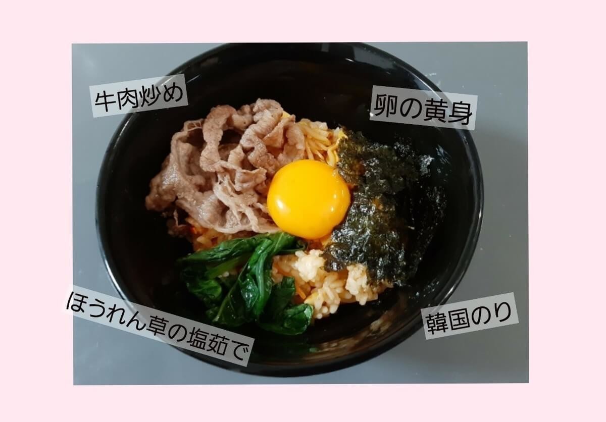 今回は韓国のりと牛肉炒め、ほうれん草の塩ゆでをのせ、真ん中に卵の黄身をトッピングしました♪ 家に石焼きビビンバ鍋があれば熱々の鍋に盛り付けるのもいいですよね…!