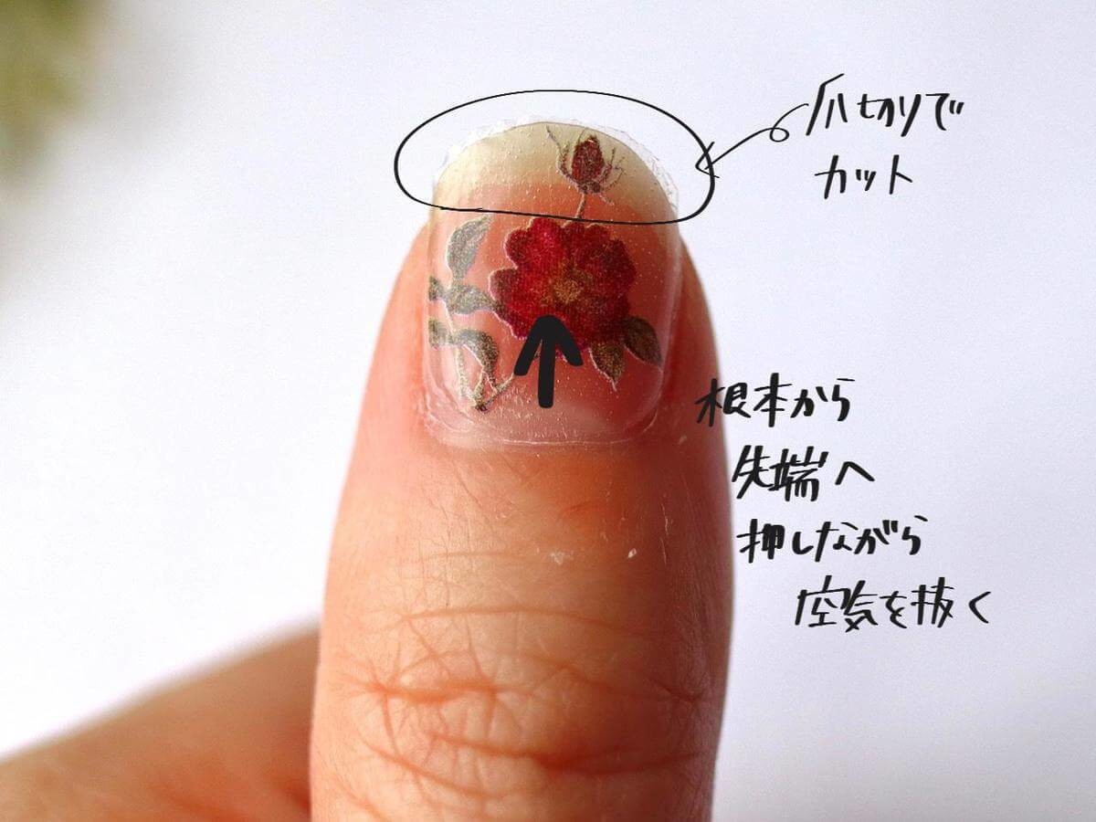 真ん中に狙いを定めネイルシールを貼った後は、根本から先端にかけて少し押しながら中の空気を抜いていきます。