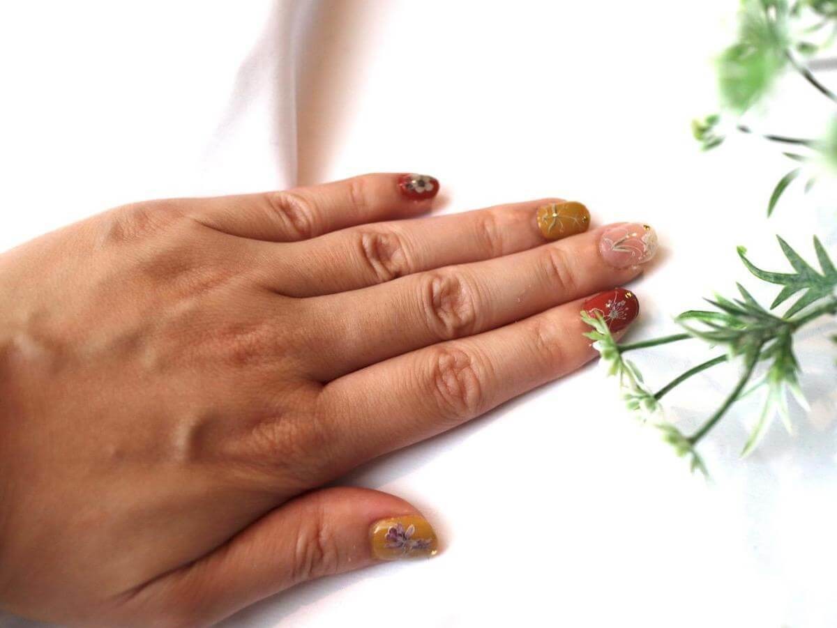 親指と薬指にマスタード・人差し指と小指にレンガカラーのポリッシュオン。