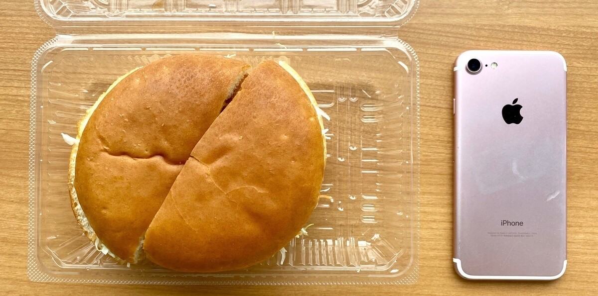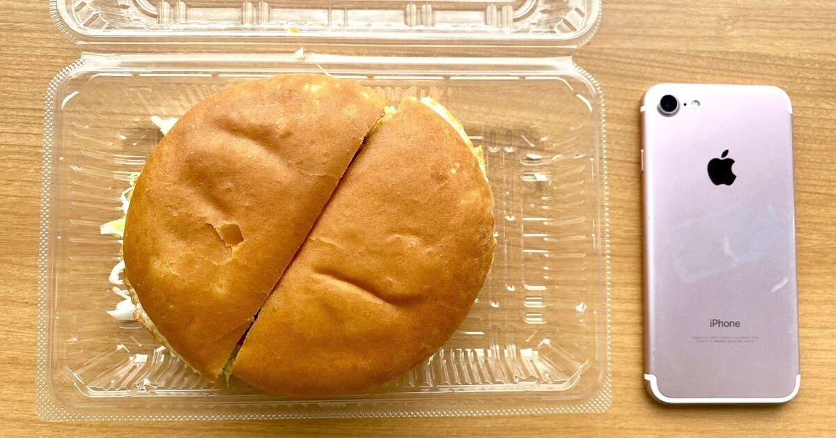 メニューで見ると一般的なバーガーの大きさのように思えますが、実際に注文してみると1人前とは思えないほどの大きさ。iphone7(138.3×67.1×7.1mm)と比べるとそのサイズがよく分かると思います。