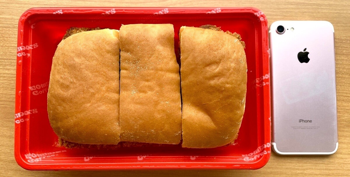 みそカツパンの大きさは、iphone7(138.3×67.1×7.1mm)3個分!1切れで十分1人前として成立するほど、ボリューム感があります。