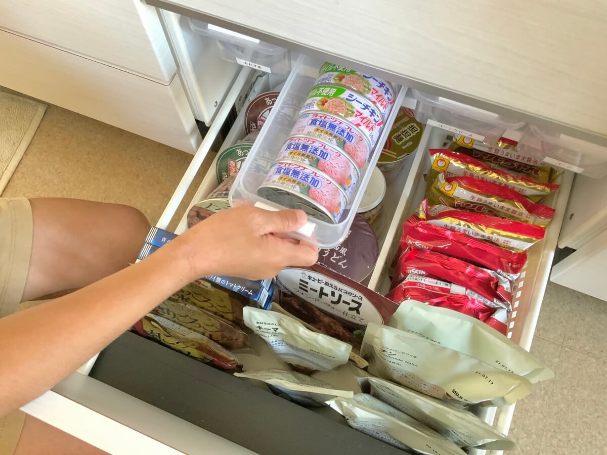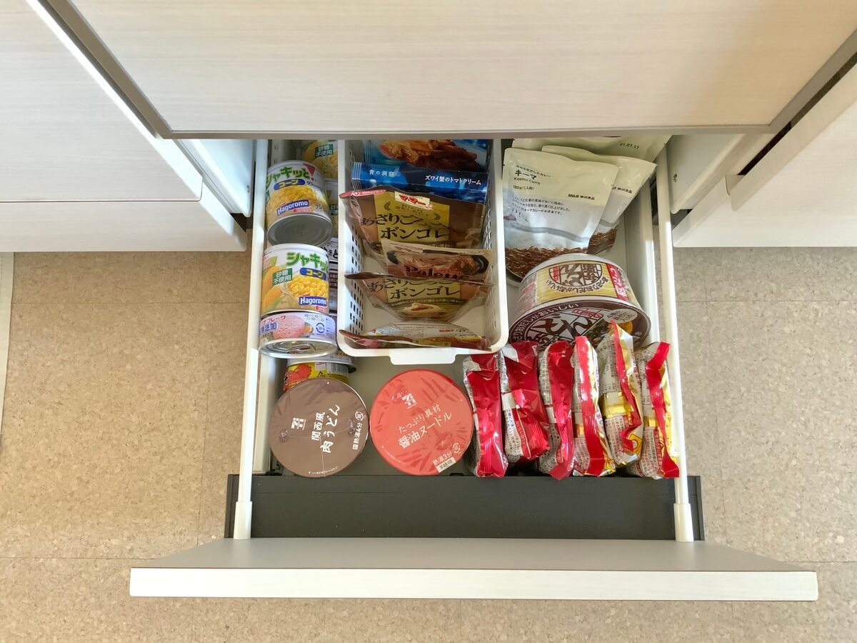 我が家の常備食収納は、キッチンシンクの1番下の引き出しです。