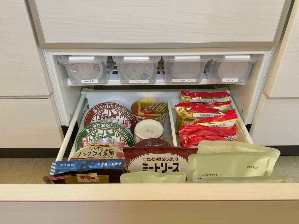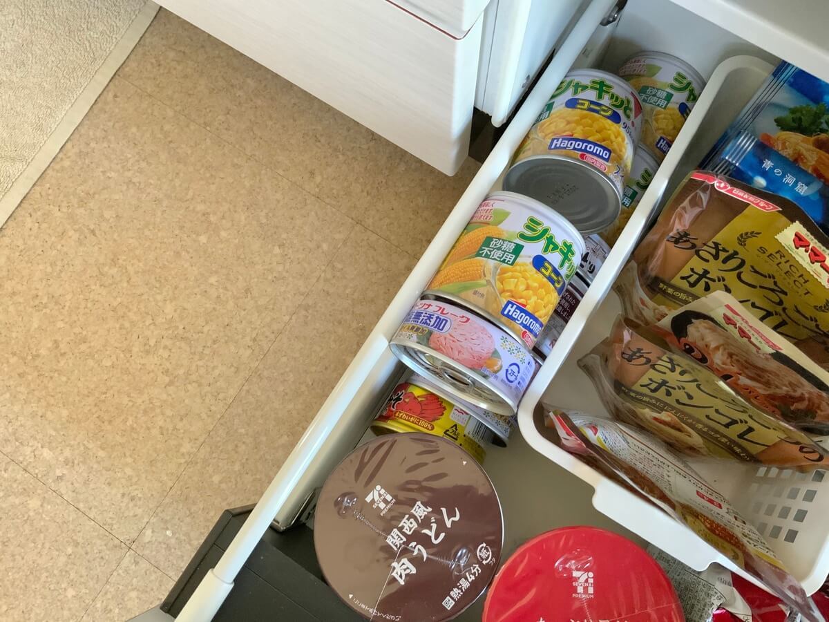 この引き出しの中に、パスタソース、無印良品のナン+キーマカレー、缶詰(スイートコーン、コーン、シーチキン、おかず系)などを収納していました。