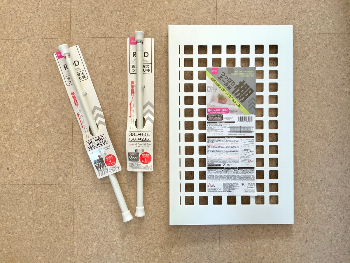 用意するのは、ダイソーの「突っ張り棒」2本と「突っ張りポール用棚」です。