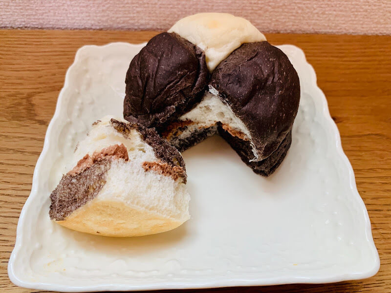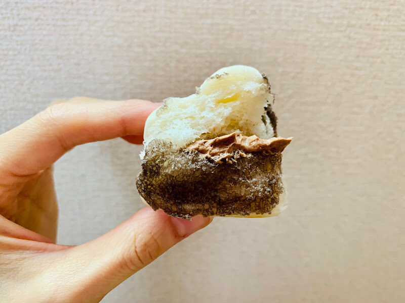 黒い生地部分はココアが練りこまれているのでしょうか、ほんのりビターです。これがまた甘いクリームと合いますね。