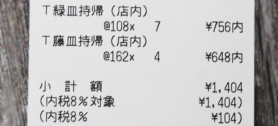 値段が違う……。少なくとも「いか1皿(2貫)」のお持ち帰りメニューをみると「140円」と記載されています。しかし、レシートでは108円の扱い。同様に「サーモン1皿(2貫)」190円のはずが162円に。