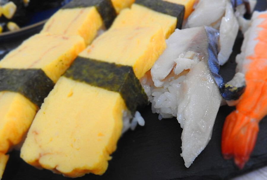 私の持ち運びに問題があったのかもしれませんが、〆さばはネタが崩れて2つに裂けてしまいました……。お皿に盛る時にはすでに裂けていたので、持ち運んでいる最中に裂けてしまったのかもしれません。
