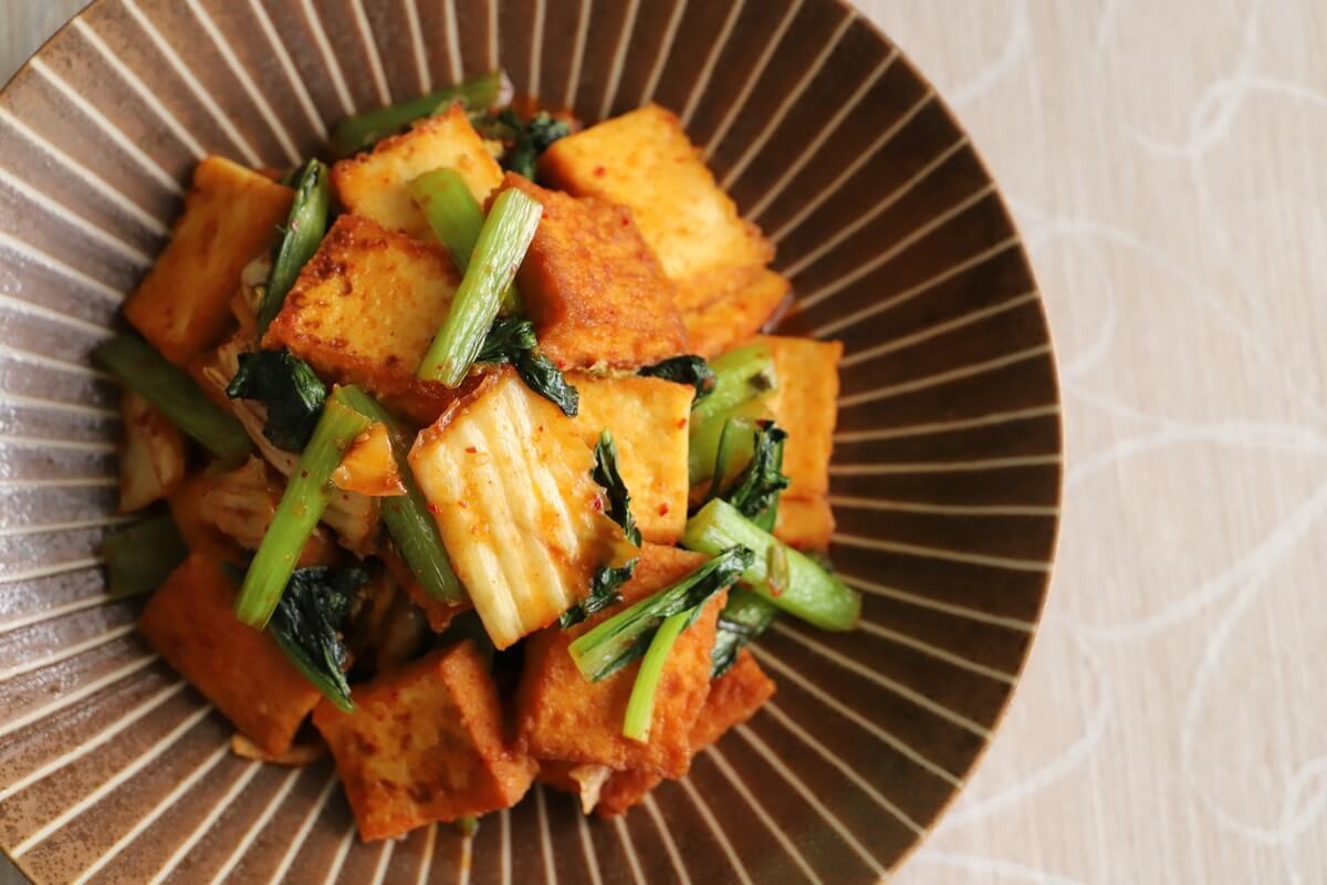 厚揚げ1袋分を一口大に切り、小松菜2分の1袋分は3~4cm幅に切る。ごま油大さじ1を入れ熱したフライパンで両面をこんがりと焼き、小松菜も入れて炒め、