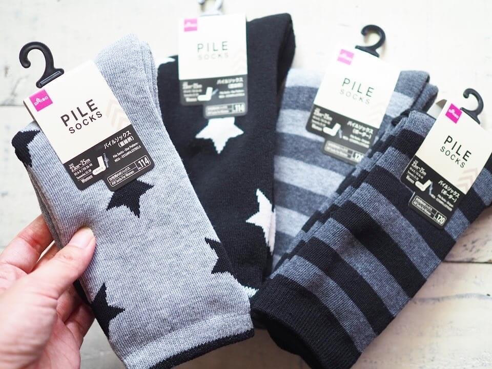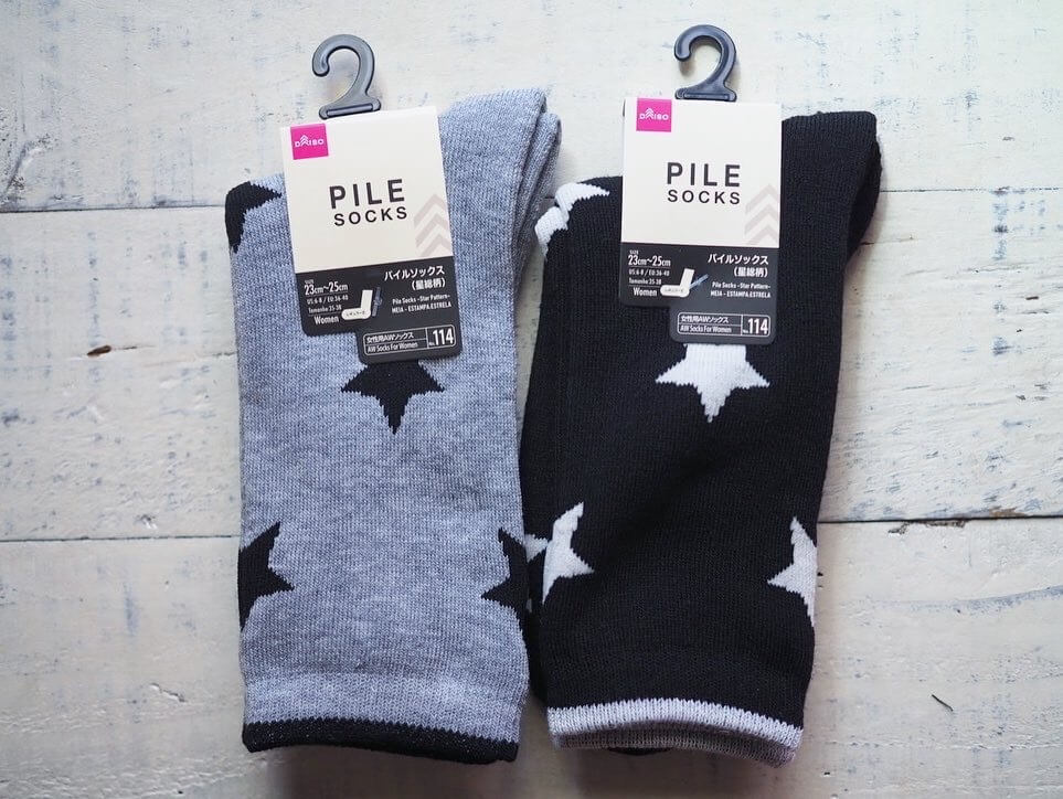 ▲ダイソー「パイルソックス 星総柄/ボーダー」各100円(税別)